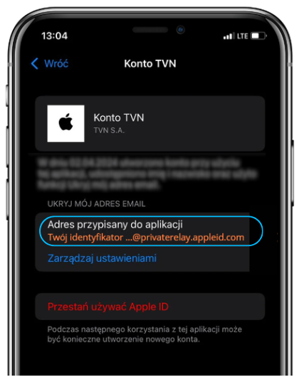 Jeśli podczas rejestracji Apple ID skorzystałeś z funkcji „Ukryj mój adres”, Apple nie przekaże nam Twojego prawdziwego adresu e-mail przypisanego do konta Apple, a jedynie zaszyfrowany identyfikator adresu (w formacie …@privaterelay.appleid.com). Dlatego przy próbie logowania do serwisu adresem e-mail powiązanym z kontem Apple ID nie odszukamy go. W tej sytuacji będziesz mógł się zalogować jedynie wtedy, gdy użyjesz zaszyfrowanego identyfikatora adresu (…@privaterelay.appleid.com) i przypiszesz do niego nowe hasło w TVN24+.